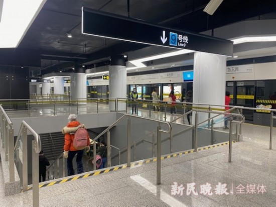云山路的下一站藍天路,是14號線換乘9號線的換乘站,這里和昌邑路站一樣,僅需上下樓梯就能“秒換”地鐵。