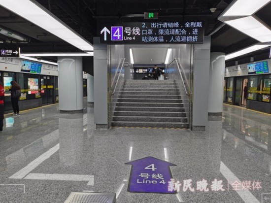 浦東大道站可換乘4號線,站臺中段設有垂直換乘的“捷徑”,走41級臺階即可來到4號線。不方便爬樓梯的乘客,也可從站臺兩頭的扶梯換乘。體驗下來,感覺14號線的乘坐舒適度也較高,多趟列車都顯示車廂擁擠度<5%。