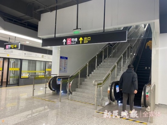 繼續乘坐14號線,兩站后到達又一個換乘站——云山路,這里可以和6號線換乘。同樣是站內換乘,云山路換乘站要走的路有點多,但因為標識很清晰,站臺和通道里還有工作人員、志愿者,記者一路走來沒有“踩雷”。乘坐電梯上行后,經過一段長長的通道,再上第二段電梯,然后繼續向前步行,很快就看到了6號線的標識。但是在這里市民必須小心,要看清是往東方體育中心方向還是港城路方向,再選擇從哪個樓梯下樓,走到站臺。
