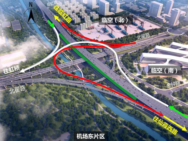 首先就是要全力配合市相關部門推進外環西段抬升。根據項目規劃,外環(桃浦路-莘朱路)在不封交通、不影響通行的情況下,2022-2025年,將在現狀車道上方另外加設主線高架,2025-2026年將現狀外環打造為地面輔道,屆時形成“高架+地面輔道”的立體交通模式。外環抬升后,可從外環輔道東西向進入臨空園區,打破固有進出臨空的模式。與此同時,將進一步完善北翟路立交功能,包括新增北翟快速路往臨虹路、往仙霞西路兩根匝道,增設臨虹路以南、仙霞西路以北兩對上下匝道,外環貫通輔道系統等綜合提升措施,使中心城進入臨空更便捷、臨空往虹橋樞紐快速化、外環與北翟路地面平交口更高效。
