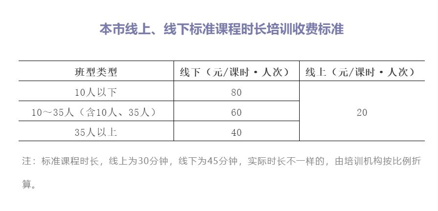 按照國家“要區分線上和線下以及不同班型,分類制定標準課程時長的基準收費標準”的要求,根據國家規定的主要定價班型,確定了本市線上、線下學科類校外培訓的基準收費標準和浮動幅度。