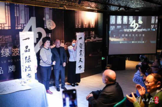 書法家現場揮毫潑墨,書寫“一點宴天下,一品綠波廊”為綠波廊42周年慶生。