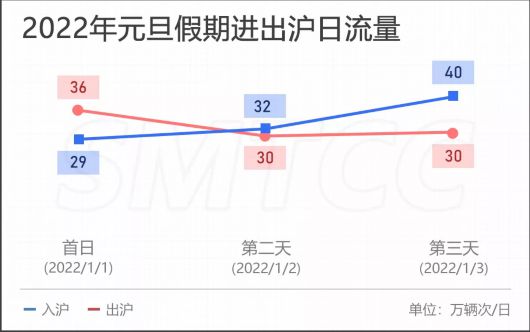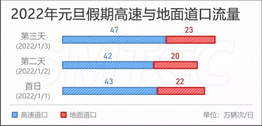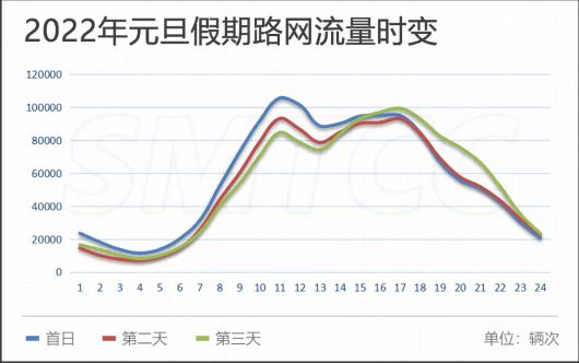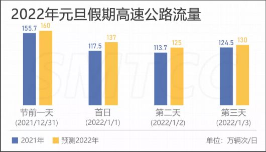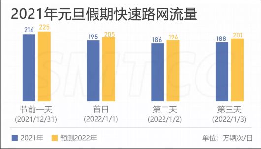 預計2022年元旦假期路網總體流量達603萬輛次,日均流量約201萬輛次,同比上升3.1%,與節前雙休日流量相比上升5個百分點。