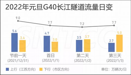 預計元旦期間長江隧道日均流量約7.5萬輛次,同比增長10.3%。長江隧道流量方向性較為明顯,假期前一天及首日長江隧道流量以上行(江蘇方向)為主,其中節前一天高峰出現在下午15至20時,首日出行高峰出現在9時至12時,高峰小時流量達約5100輛次。節日最后一天長江隧道流量以下行(市區方向)為主,高峰出現在下午14至18時,高峰小時流量達約5500輛次。