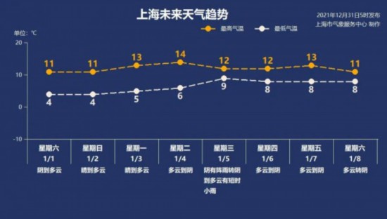 元旦期間,上海以多云天氣為主。氣溫變化不大,總體保持在4~13℃之間,平均氣溫較常年偏高。具體: