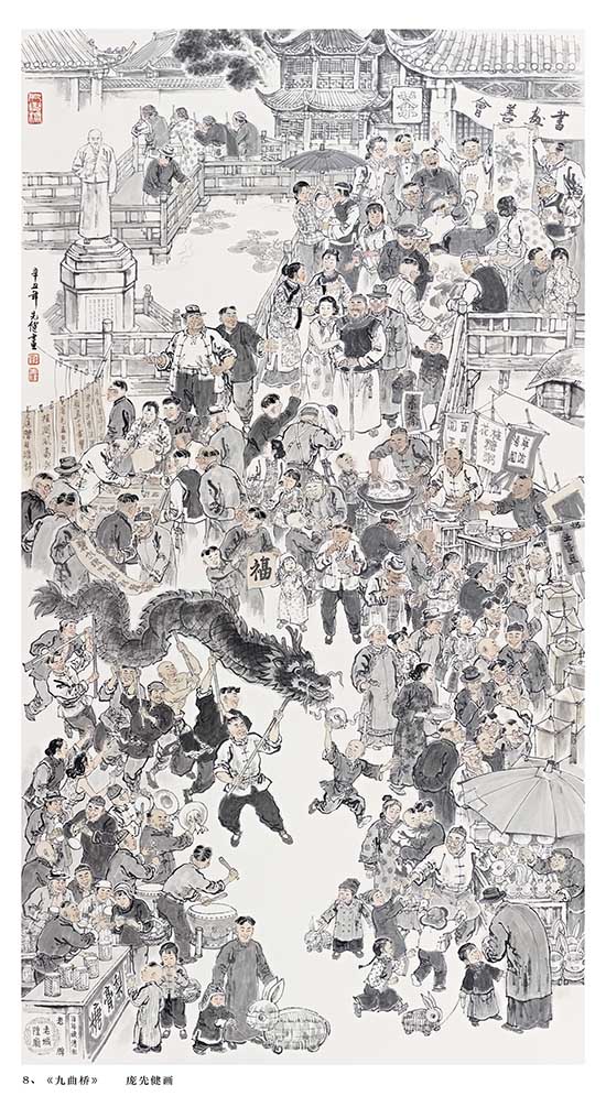 展覽中特別引人矚目的是一套《上海百年紀事》作品,整個畫展以此為題!渡虾0倌昙o事》選取老上海典型地點,并圍繞該地點發生的故事為主題,畫面中,既有市民百態,也不乏大量的歷史人物和重要歷史事件。該套作品由《洋涇浜》《九曲橋》 《張氏味莼園》《十六鋪》《四馬路》《愛儷園》《百樂門》《大世界》《上海解放》等構成。