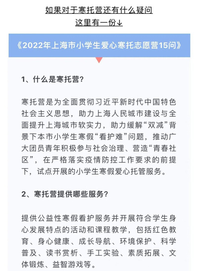 寒假的腳步越來越近,好消息來了!2022年上海小學生愛心寒托志愿營即將開營!長寧區共設有五個點位,可采用線上線下相結合的方式報名。