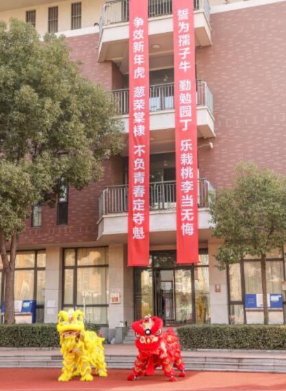 隨后,在全校師生的見證下,兩條帶著老師們滿滿誠意祝福的巨型春聯從學校行政樓4樓飛落而下:“誓為孺子牛,勤勉園丁,樂栽桃李當無悔;爭效新年虎,蔥榮棠棣,不負青春定奪魁!”在辭舊迎新之際,同濟大學第一附屬中學大力營造弘揚中華優秀傳統文化的濃厚氛圍,引導師生們感受傳統文化魅力,以文化人,以文育人,以中華優秀傳統文化滋養師生心靈、涵育師生品行、引領社會風尚。