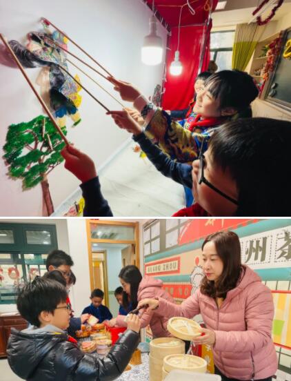 在二年級主辦的家鄉物產博覽會現場,有著來自大江南北的特色物產。轉眼間,孩子們來到了大美新疆,一會兒又去了首都北京,不一會兒就回到了家鄉上!蠹以谄穱L新奇美食的同時,也感受到了祖國的地大物博。在五年級的“民間藝術交流會”現場,孩子們參觀著琳瑯滿目的展品,體驗著刮畫、飛花令、歌舞、演奏、紙藝等手工實踐,更好地“傳承優秀,演繹精彩”。