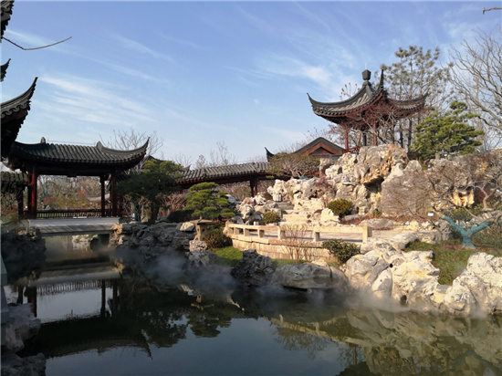 申園總占地5公頃,總體規劃形成北山、南水、東園、西苑的空間布局,構筑醉紅映霞、古柯晚渡、玉堂春滿、松石泉流、曲韻天香、秋江落照、煙雨蓬萊、荷風魚樂八景。山環水抱之中的建筑群落,呈現了明清時期江南傳統園林的風格。