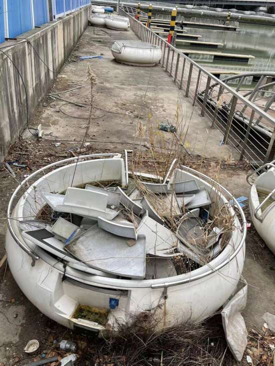 如今,丹巴路碼頭成了廢棄的一角。有的地方已銹跡斑斑。岸邊散落堆砌著幾只廢棄的船只圓形部件,里面長出了葦草。走出這片區域發現,當初配套引入的44路、766路公交的終點站依然在運營。