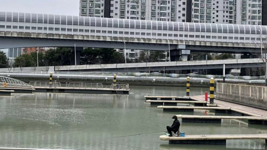 平靜的河面,幾只水鳥在盤旋。親水平臺延伸出的護坡上坐著一位垂釣者,手執長桿,凝神閉目。不遠處,亦有兩位垂釣者,各自占據著平臺的一角。