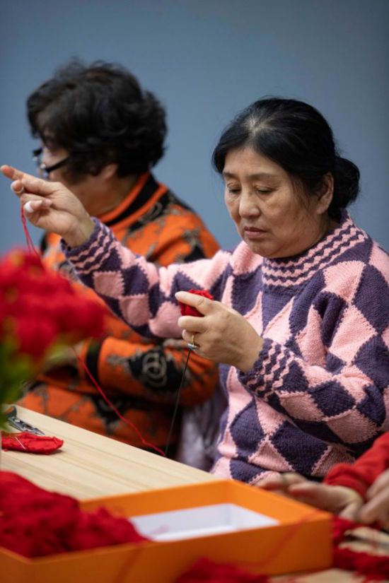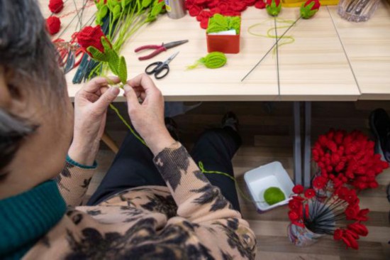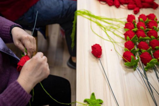 130多位阿姨每天“居家辦公”編織玫瑰零件,完成的零部件從各個社區運到婦女兒童活動中心,再由這里的15位阿姨完成組裝。而組裝,是最關鍵的一部。