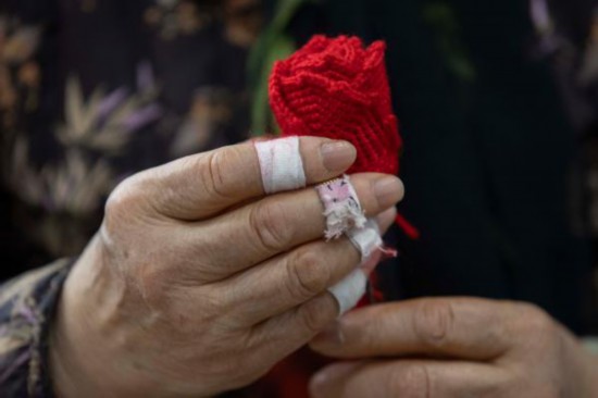 發明這個方法的是今年80歲的牟國英!拔邑撠煱炎詈笏钠蠡ò昶瓷先,這一步關系到花朵的整體造型!泵恳欢浠ò昶瓷先r都有一個拉緊絨線的步驟,牟國英的手因為每天拉線而開裂,四根手指頭都綁上了膠布。