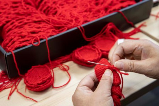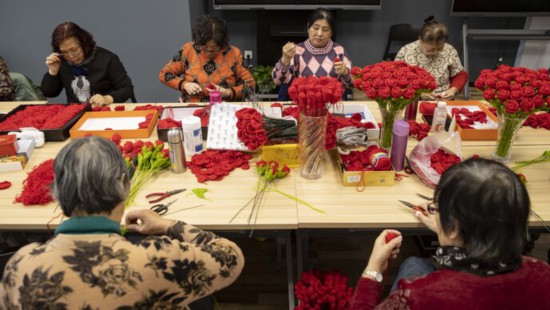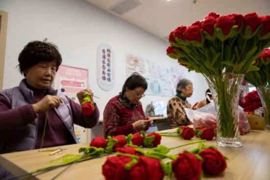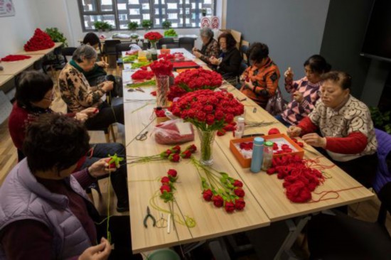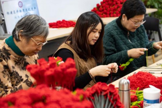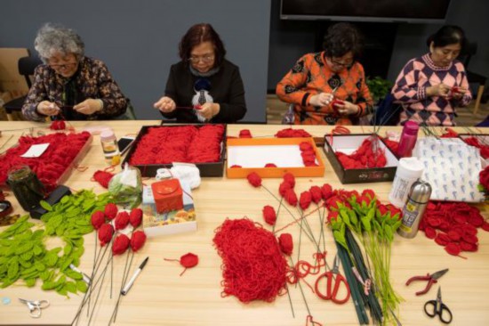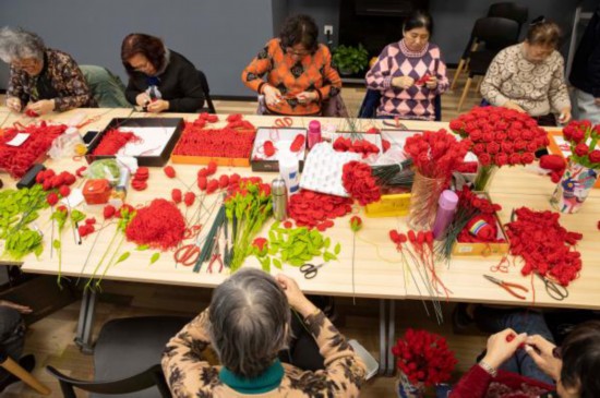 2021年1月6日,位于上海楊浦區國和1000廣場的楊浦區婦女兒童活動中心內,黃宏英和15位“巧手媽媽”正在忙碌地編織紅玫瑰。4400朵純手工制作的絨線紅玫瑰在這里完成組裝,它們將被送到北京2022年冬奧會和冬殘奧會現場,成為世界各國運動員手中的獲獎花束。