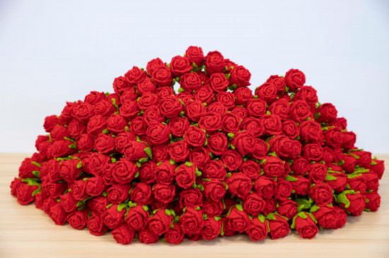 一朵玫瑰花,包含多少工藝?黃宏英現場向記者進行了拆解說明!12片玫瑰花瓣分為三個尺寸,5.5厘米的大片花瓣共5片,5厘米的中片花瓣有4片,4.5厘米的小片有3片,加上花托和葉子,一支玫瑰由一個人從頭到尾做下來,至少需要8小時!焙髞,黃宏英想到了采用流水線操作的方法,把一朵花拆分成不同的零部件,節約三分之一的時間。