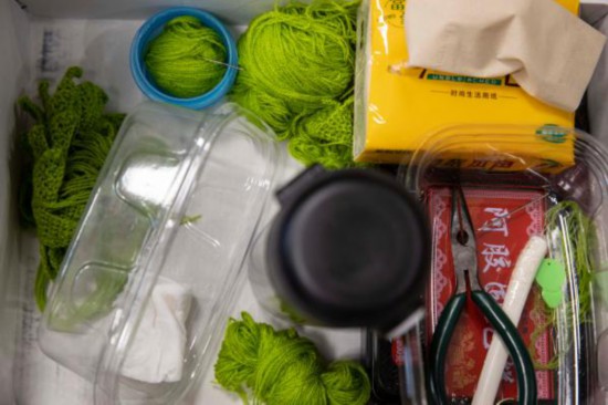 童杏花每天早上7點從家里出發,乘坐公交車一個半小時才到婦女兒童中心。她已經來這里“上班”2個多月。編織是童杏花的愛好,退休后她在社區擔任巧手媽媽發起人,給居民上編織課。四年前,她生了一場大病,目前正在恢復階段!霸炯依锶耸欠磳ξ襾淼,擔心我身體吃不消,但我喜歡和大家一起干活,覺得還能發揮一點價值,我很開心!