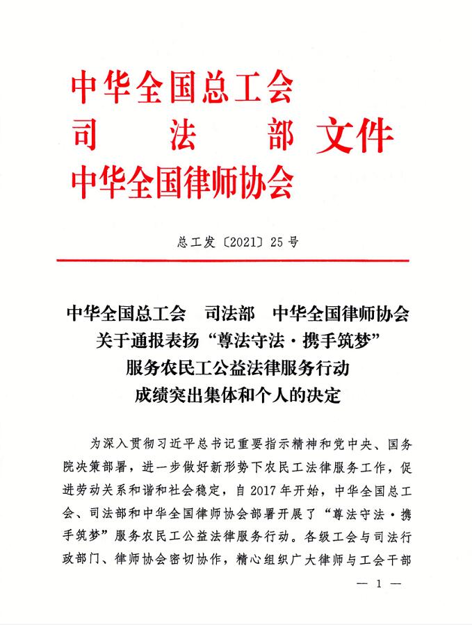 近日,中華全國總工會、司法部、中華全國律師協會發布《中華全國律師協會關于通報表揚“尊法守法·攜手筑夢”服務農民工公益法律服務行動成績突出集體和個人的決定》(總工發〔2021〕25號),表揚全國“尊法守法·攜手筑夢”服務農民工公益法律服務行動成績突出集體和個人,上海市寶山區總工會榮獲成績突出集體。