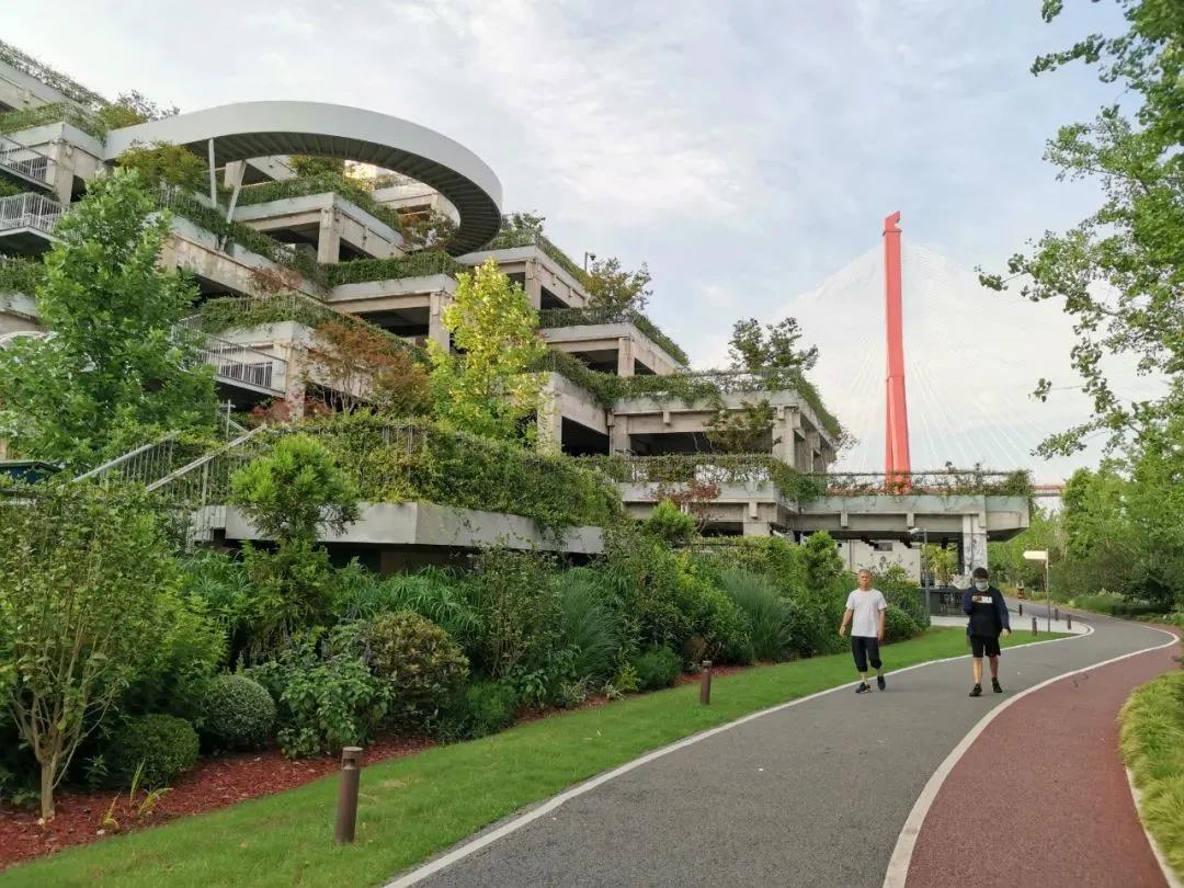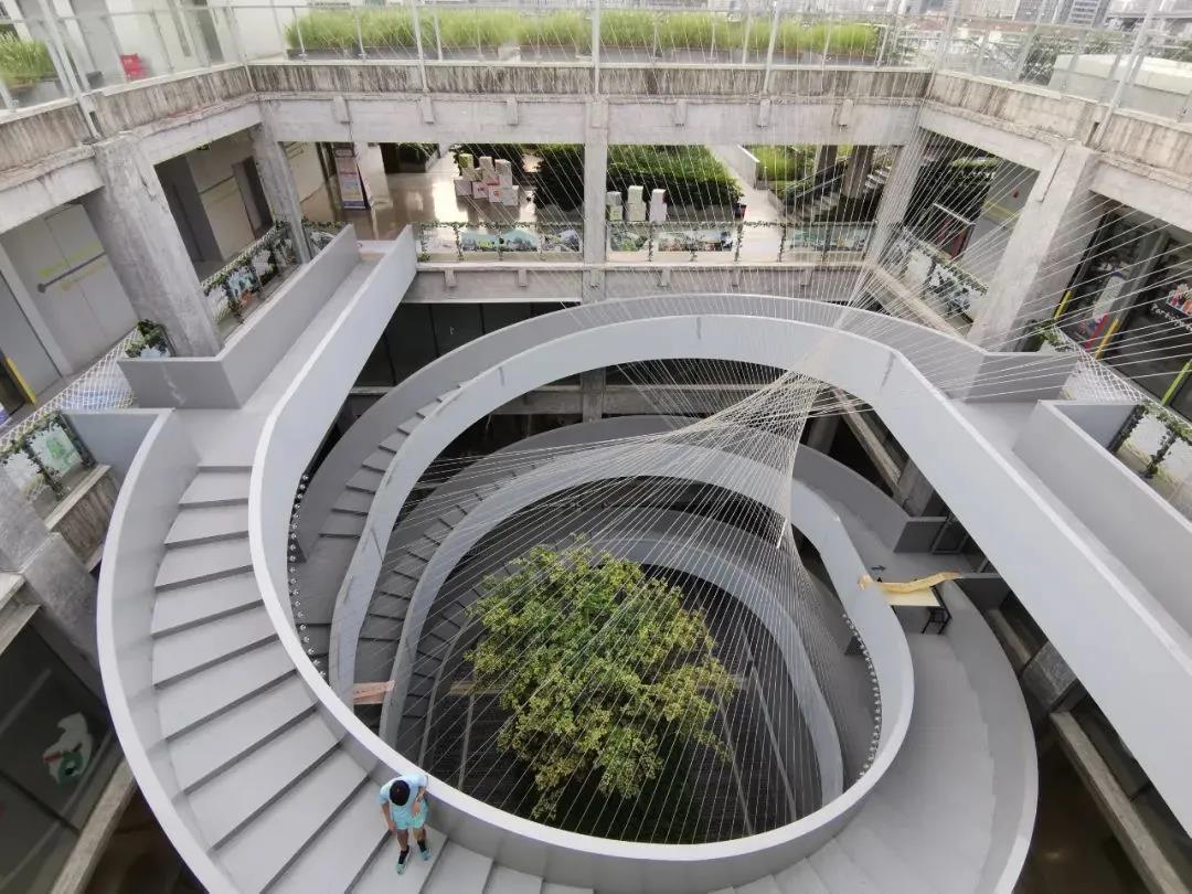 從外觀看,這是一座濃濃工業風的鋼鐵森林,回旋樓梯,天臺花園,從二層起逐層收縮形成層層疊疊的露臺宛如迷宮。頂樓有一段U型步道,提供270度觀景平臺,漫步其間,有一種騰空臨江的視覺效果。每層露臺上種植著綠樹花草,整個建筑好似一個“空中花園”。