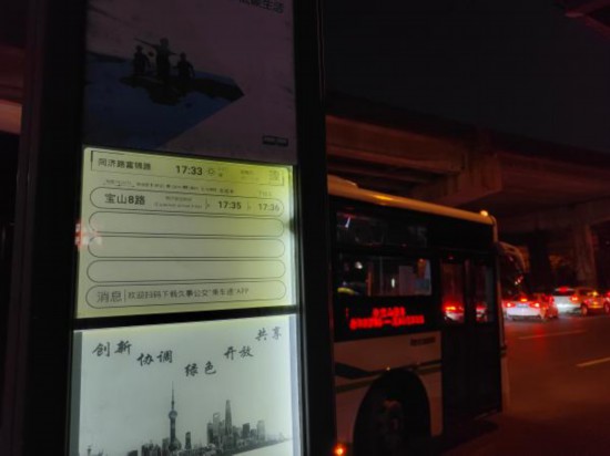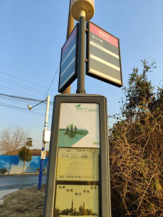 郊區的公交車發車間隔較長,提供準確的到站信息可以顯著改善乘車體驗。2021年12月30日下午4時20分,在寶山區北部的月浦鎮錢陸路,王阿姨正準備乘坐寶山12路公交車前去換乘地鐵。這趟線路兩趟車間距50分鐘。上了車,記者詢問候車體驗,她回答:“很好呀,有時間,下趟車幾點來我也知道,是5時11分!痹瓉,這條公交線路每站都有電子站牌,集成在三棱柱型站牌的一面,另外兩面則補充了一些經停站點的信息。有了預估到站的時間,市民可根據時間信息靈活調整乘車計劃。小小的電子站牌讓人心里有底。