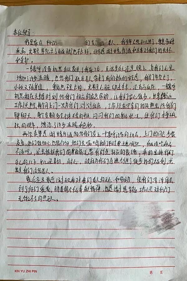 “我已經80多歲了,身患多種疾病,尤其是年紀大了腿腳也不太好,感謝街道和居委為我安裝了“家庭照護一鍵通設備”,現在無論是白天還是晚上,為我們心里增加了許多溫暖……”家住平利路的吳老伯向甘泉路街道送來了一封感謝信,字里行間滿是謝意與安心。