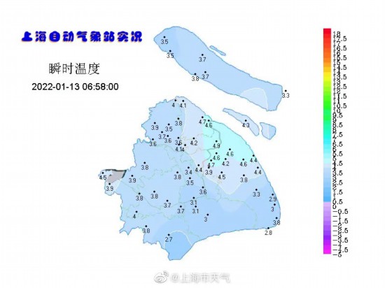 今日上海多云為主,全天氣溫2~7℃之間,相對濕度在90%-25%。上一股冷空氣剛剛平息,今天受弱冷空氣影響,北風再起,氣溫被牢牢壓制在低位,早間市區3℃附近,郊區更低,偏北風4-5級陣風6級。風寒效應下體感更加冷,大家要注意做好保暖工作。此外,受到上游顆粒物擴散影響,今天中午以前有輕度霾,下午空氣質量有所好轉。