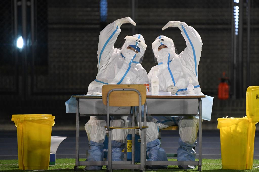 2022年1月10日凌晨,在天津市南開區鼓樓街道中營小學核酸檢測點,兩名醫務人員做出“比心”手勢。新華社記者 孫凡越 攝