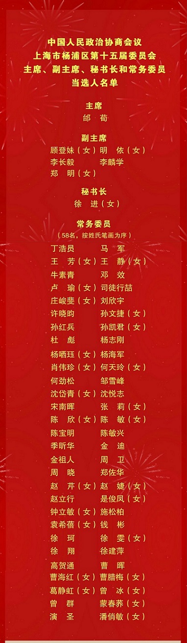 政協楊浦區第十五屆委員會主席、副主席、秘書長和常務委員當選人名單