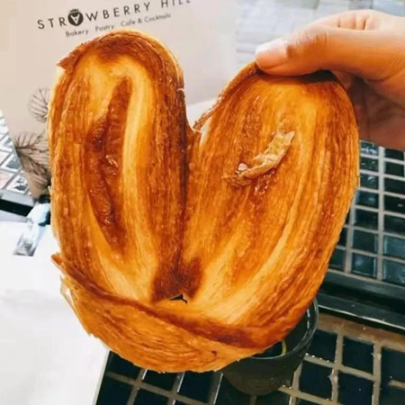 與海派蝴蝶酥不同,米咖焙坊的蝴蝶酥屬于經典的法式蝴蝶酥,飽滿平整的造型,層次分明的酥皮,酥脆但不硬,表面些許顆粒感的砂糖也在烘烤下變身為褐色的焦糖,呈現不一樣的視覺效果。