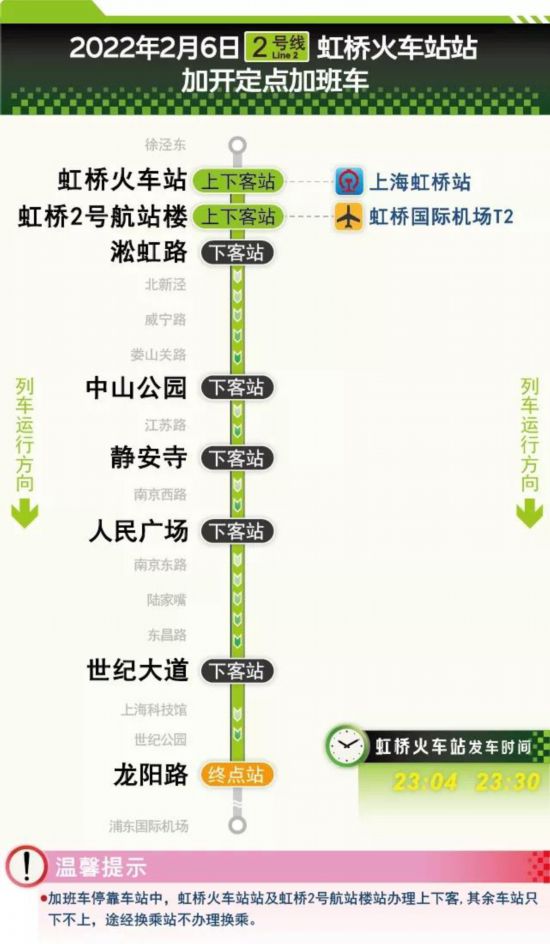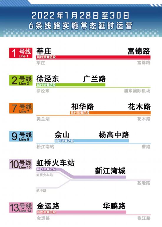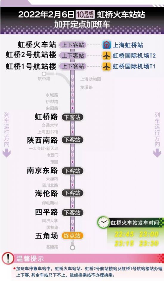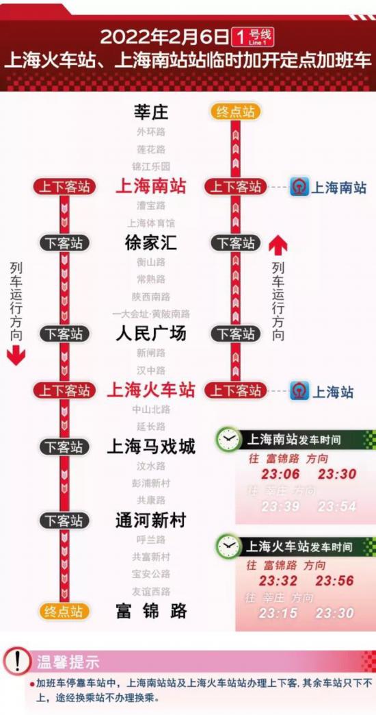 地鐵方面,為滿足春節期間乘客夜間出行需求,緩解客流壓力,1月28日至30日,上海地鐵1、2、7、9、10、13號線執行常態周末延時運營方案。2月5日起,上海地鐵1、2、3、4號線將實施“多頭班車”方案,即1、3、4號線上;疖囌菊,2號線虹橋火車站站,以及1、3號線上海南站站將在首班車前后,視情再投放列車。