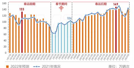 春運期間,上?焖俾肪W總體流量預計將達7690萬輛次,日均規模192萬輛次,同比2021年上升1.4%。春運開始后,搭乘高鐵或飛機返鄉出行逐步增長,虹橋火車站客流發送量和比重將雙雙提升,屆時前往虹橋樞紐方向的快速路流量將隨之出現明顯增長。