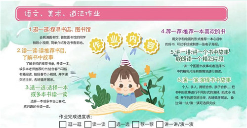 在學生寒假作業任務單上,教師們清晰標出了每項任務所囊括的學科內容。例如,《最美學習風尚·邂逅書香》主題任務結合了語文、美術與道法三門學科的內容,學生們需要和父母一同探尋身邊的書店和圖書館,選擇一本老師推薦或自己感興趣的書進行閱讀,并在閱讀完成后運用繪畫、表演、文字等形式重新演繹作品內容或閱讀后的感受。