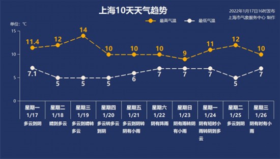 上海中心氣象臺2022年1月18日5點鐘發布今天和明天上海市天氣預報: 多云到陰,今天上午起晴到多云,明天多云到晴。偏東風,明天偏南風,風力都是3-4級。今天最高溫度12度,明天最低溫度5度。今天相對濕度40%-90%;痣U等級氣象指數:4級,易燃。