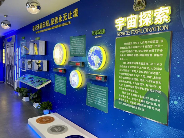 這一板塊還有一處十分有趣且互動性很強的區域——星球稱重體驗裝置。該裝置分為地球、月球、火星三個稱重區,只要站在上面,就能夠顯示出人在不同星球環境里,各不相同的體重。