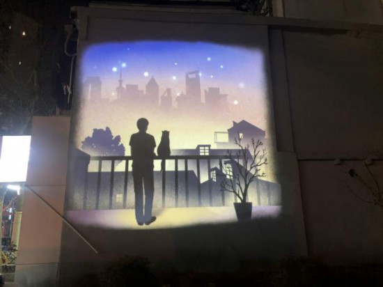 往東走來到新閘路258號,只見側墻上出現了一幅以老城廂記憶里的時光為主題的投影畫,這是第二個景點“閃亮的時光”。頗為有趣的是,畫面中的貓會搖尾巴!斑@幅畫表達了對美好過往的珍視和對無限未來的向往,體現了蘇州河畔融合過去、現在、未來的豐富文化內涵!秉S浦區燈景所工作人員鄭夢姣介紹。