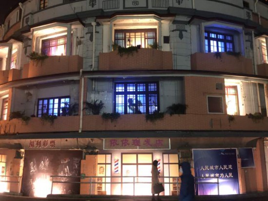 浙江路橋兩側是第五個景點——萬家燈火。燈光開啟,不少路過的市民紛紛駐足拍照。已經因拆遷人去樓空的老房子里,被布置了燈光和模特,有人在吹薩克斯,有人在跳舞,還有一只貓。