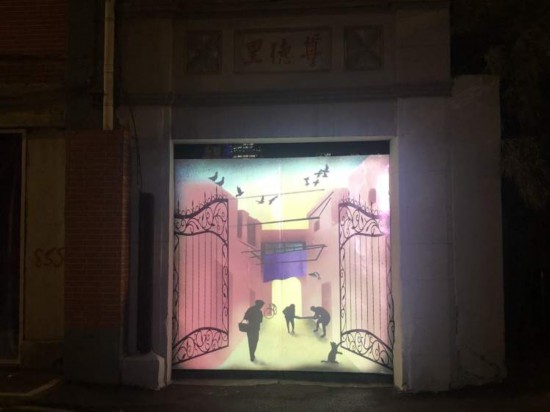 南蘇州路723號是第六個景點——沉魚落雁。建筑立面上,通過光的傳遞,呈現出鴿群飛過天空的場景,以螢火蟲燈營造出星星點點的夢幻星空背景,再用不規則的不銹鋼薄片制作出簡潔的影子藝術裝置,通過巧妙的光照角度在建筑外立面上投射出鴿群的影像。據悉,這幅作品讓虛幻和現實交錯相印,代表了人們向往自由的心。