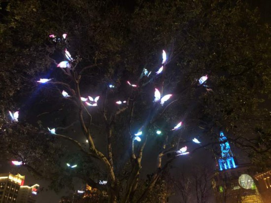 走到乍浦路橋的櫻花谷是第八個景點“影動外婆河”光影秀。來到這里,仿佛進入了一個浪漫的世界,地面上櫻花花瓣在飛舞,空中,泡泡機吹出的泡泡飛揚,樹上“蝴蝶”一閃一閃。光陸大樓頂部,光束燈模擬皓月當空,靜謐的月光穿過紫藤形成月光下斑駁的影。