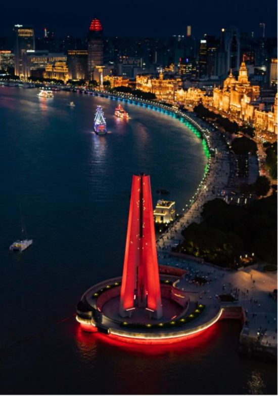 人民英雄紀念塔是黃浦蘇州河夜景的第九個,也是最后一個景點——庚續紅色血脈。紀念塔的燈光設計在原有的紅色基底上利用激光增設了呈上升形態的“星火”動態效果,既代表永不熄滅的英雄火炬,又象征著昂揚向上的時代精神。同時,運用雙色溫技術在紀念塔底座臨江部分打造“紅底金星”的景觀效果,既凸顯紀念塔的主旨,又與外灘水景燈光相呼應,呈現“星耀東方”、“星星之火”、“薪火相傳”三種動態模式,可根據不同活動的需要隨意切換。優化完成的紀念塔燈光也是浦江光影秀展演的“起音”,點亮信念之光,賡續紅色血脈。