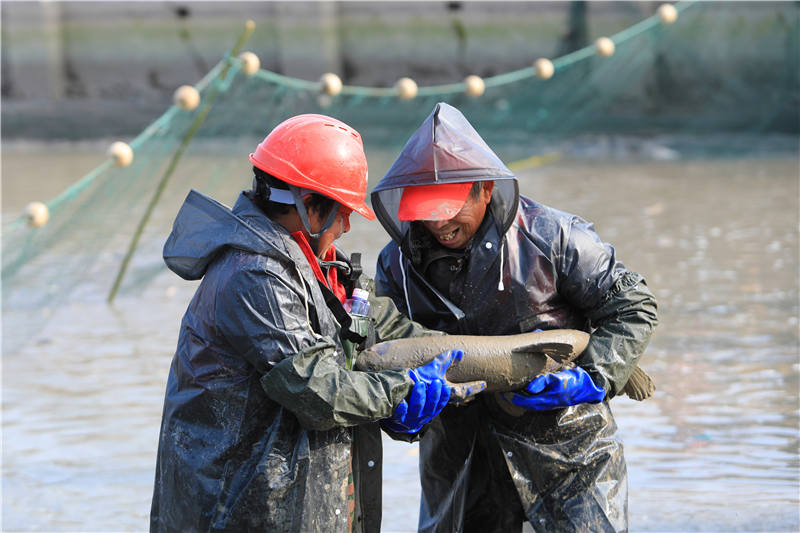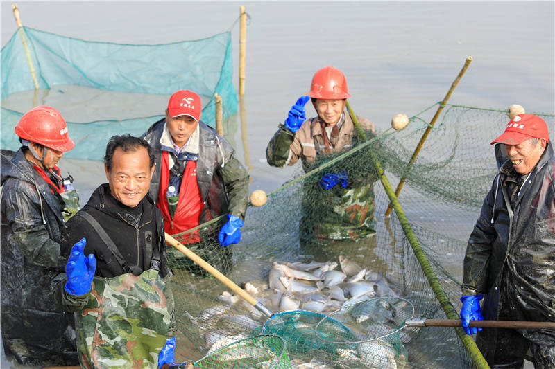 捕上來的刀魚、草魚、鯽魚、扁魚、昂刺魚等約4噸,相較于去年產量翻了一番。最重的一條魚有10斤,精心喂養的魚兒活力十足,個頭又大,村民們紛紛幫忙將大魚裝框,等待分魚。