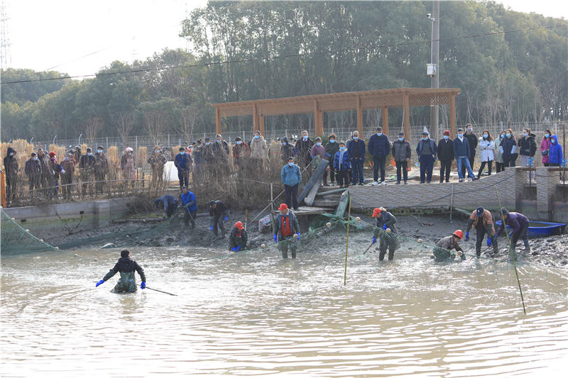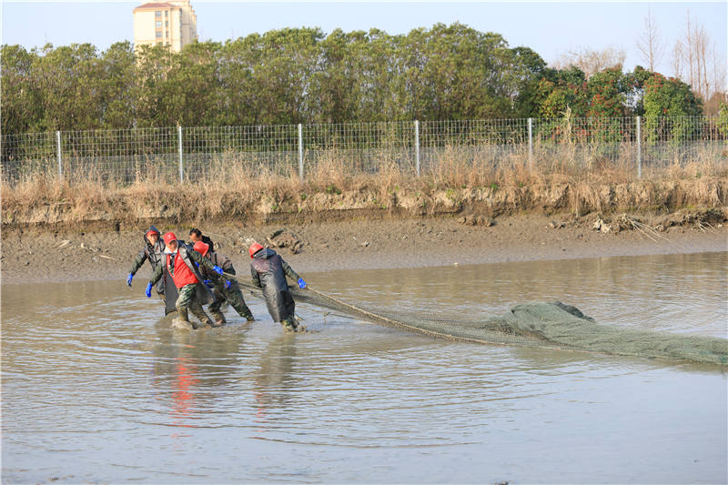 人民網上海1月20日電 又到了一年一度的緊張刺激的捕魚大場面!1月18日一早,奉賢區南橋鎮華嚴村“橘米公社”魚塘里的水早早就被村民們被抽干了一大半。里面的魚越發活躍起來,水波驟起、浪花四濺。村民們穿好捕魚皮衣,抓緊漁網各角,慢慢下水!奥c慢點,你把網再往那邊拖點”,塘底淤泥厚重,村民們深一腳淺一腳,齊心協力地把沉甸甸的漁網在魚塘里拉開。