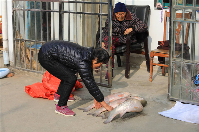 配合著漁網,村民們紛紛直接下手抓魚。兩個小時左右,那些在泥水上面蹦跶的魚就抓得差不多了。塘水順著手腕灌濕了村民們的棉衣,可絲毫不影響豐收的心情。捕魚之際,可愛的村民們還向岸上的人比頻頻“耶”。抱著兩個人合力才能抱住的大魚,村民們都露出了幸福的笑容。