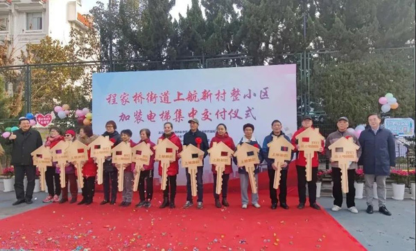 1月19日上午,長寧區程家橋街道上航新村成片化加裝電梯集中交付儀式舉行,13臺電梯集中交付使用。至此,上航新村小區16臺加裝電梯全部投入使用,成為長寧區首個加梯全覆蓋并全部交付使用的小區。