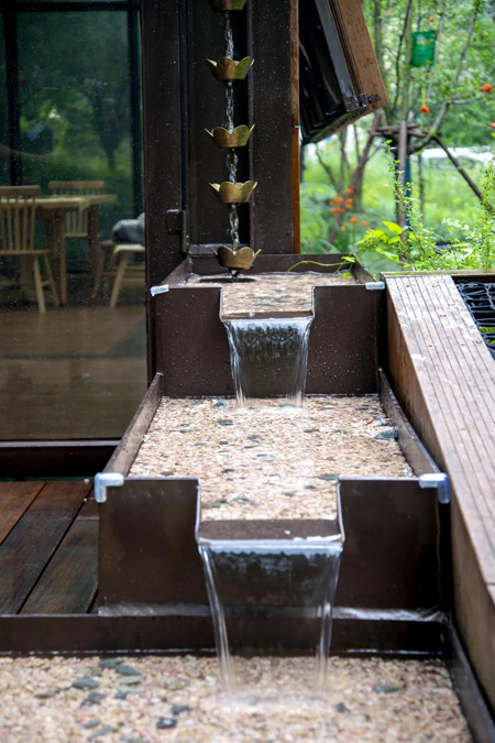山房特有的斜頂設計,將雨水排向一角,匯集在花瓣形的金屬雨水收集器中,小瀑布似的層層向下流出,落在具有四層砂石過濾系統的木箱中,最終流向一旁的鳶尾池塘成為自然凈水,為市民和青少年生動地上了一堂水生態科普課。