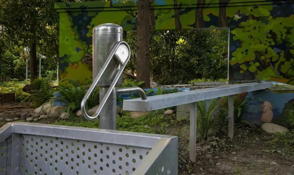 位于樂頤生境花園的最南端,緊鄰南漁浦河道,為園區保護鄉土動、植物的核心區域,這里安裝了包括解決鳥類飲水的“靜水流觴”,與大自然融為一體的“自然之眼”,還設有人工手動壓水泵。