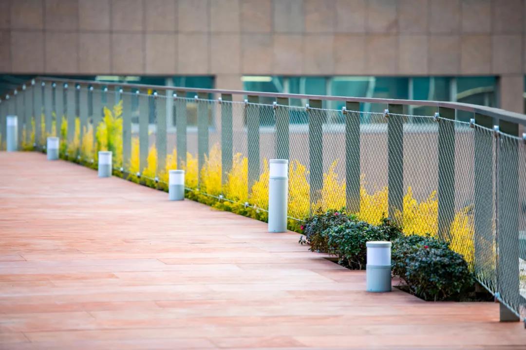 徐家匯空中連廊二期為周邊居民和上班族提供了新的漫步空間。二期工程與一期工程同樣采用了越秀木地板進行鋪裝,具有穩定性和耐久性,相比普通石材,可以給行人帶來更舒適的步行感受。連廊兩側布置了黃金香柳、比利時杜鵑、花葉蔓常春藤等綠植,弱化了建筑結構的生硬感,營造出繽紛綠溢的景觀效果。通過設置高低起伏的圓柱形燈具,配合寬度參差變化的木地板造型,形成具有韻律感的照明景觀。
