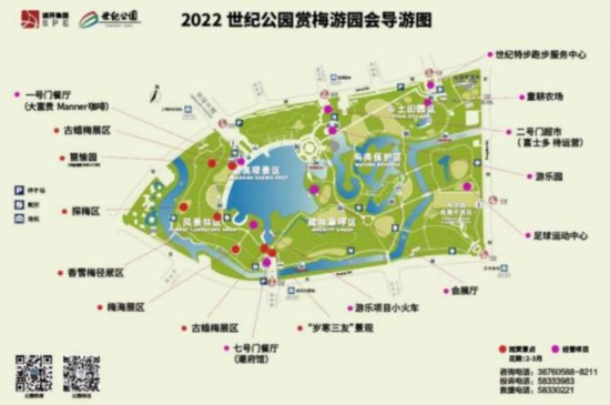 世紀公園今年的賞梅游園會將持續到3月20日,500余株蠟梅,4000余株梅花將競相開放。公園的梅園占地10萬平方米,布置古蠟梅區、探梅區、香雪梅徑展區等五大景區和“歲寒三友”小景,游客可以在梅海中倘佯,賞梅花、聞梅香、品梅韻,也可以細細品鑒梅花、蠟梅盆景,領略中國園林文化的精髓。