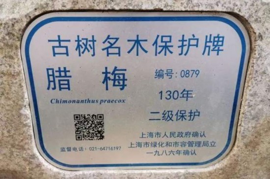 在奉賢曹氏庭院中,有一株罕見的古蠟梅,距今已有160多年歷史,是上海最年長的蠟梅,也是受到保護的古樹,編號0879。