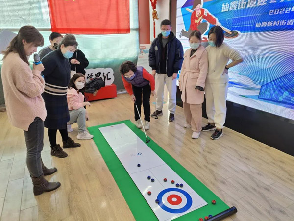 “他們紅隊擅長防守,攻擊他們的中線,這一次我們藍隊肯定要贏!”“一壘最重要,防住對方的進攻路線!被顒踊顒幽_腕,伸展伸展胳膊,在“冰雪之約”冬奧主題項目體驗“陸地冰壺”賽場,參加比賽的居民邊做賽前熱身運動邊商量戰術,F場裁判員的指令一響,第一位居民運動員走到黃線后,瞄準、蓄力、向前推出......冰壺穩穩地停在圓心,贏取一片叫好聲。