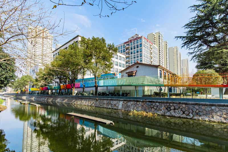 彩虹橋旁的濱河步道和人行天橋總長約 150 米,河水清澈,隱約可見河下蔥郁的水草,河道上種植著水生植物,與岸邊的樹木草地交相呼應,岸邊的彩虹天橋更為河道增添了一抹繽紛明艷的色彩,十分吸人眼球。